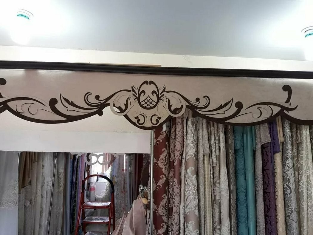 Изделие держит форму, потому что основная ткань приклеивается на бандо. Его можно изготовить из того же текстиля, что и шторы. Но возможно подобрать и другую расцветку ткани и качество текстиля. Главное, чтобы была гармония.