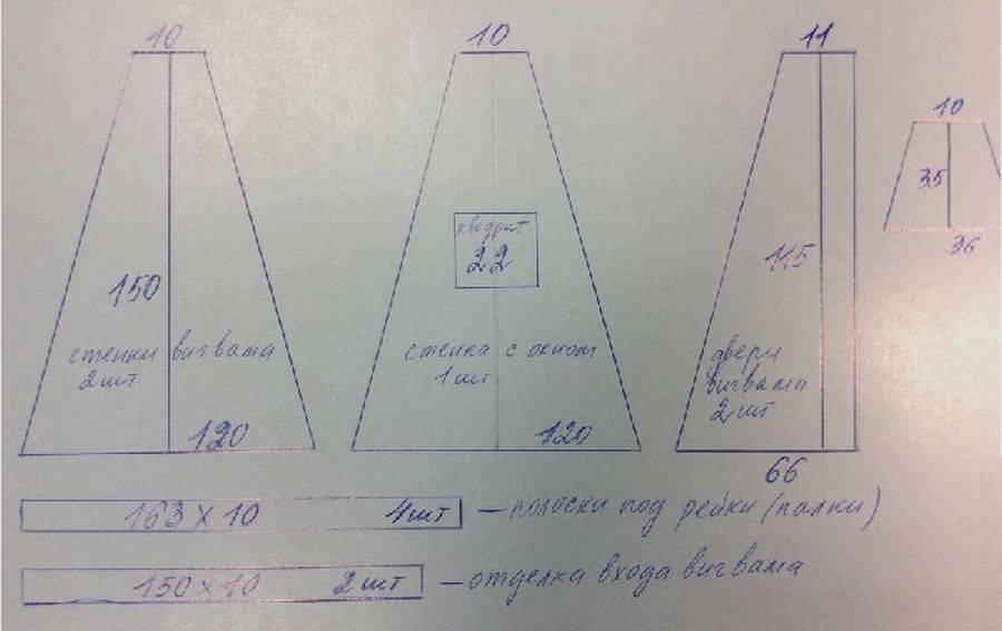 Последующим этапом станет создание тканевого чехла. Можно воспользоваться готовой выкройкой или нарисовать ее самостоятельно. Размер частей вигвама может быть различный