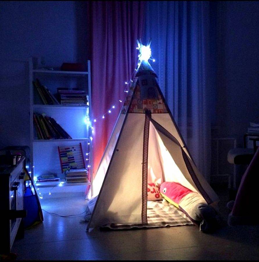 Вариант декора детского игрового вигвама маленьким светильником и электрической гирляндой, приобретенными в магазине. Создается неповторимая атмосфера волшебства.