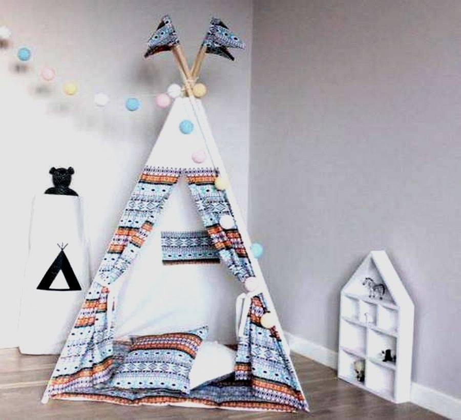 Для вигвама удачно подобрана ткань. Расцветка перекликается с убранством комнаты, узор стимулирует к жизни в гармонии с природой.