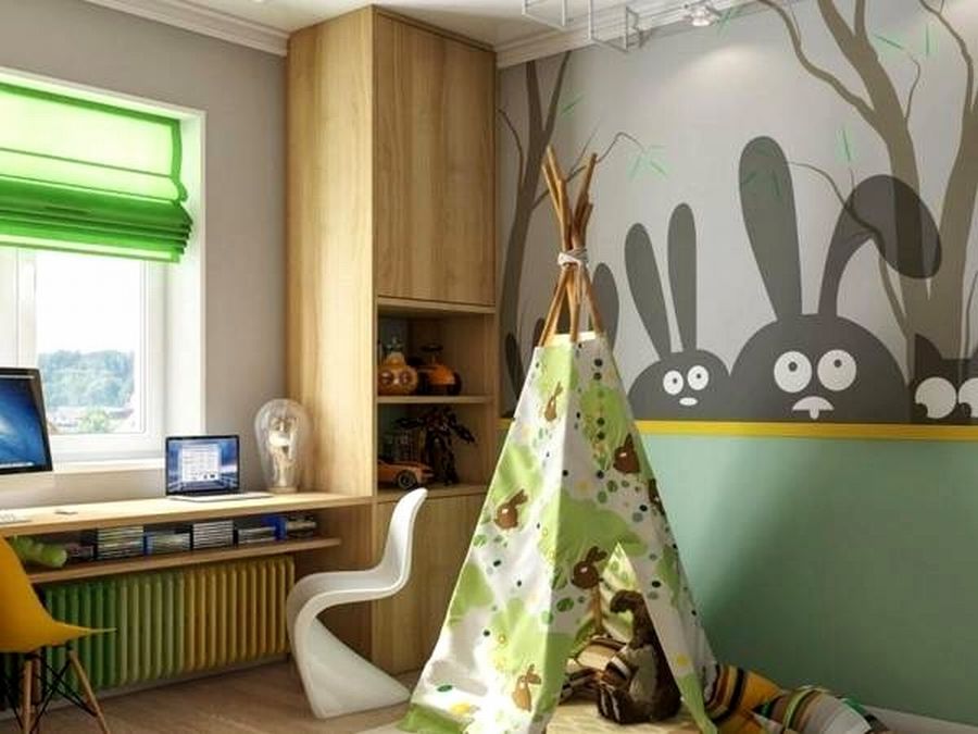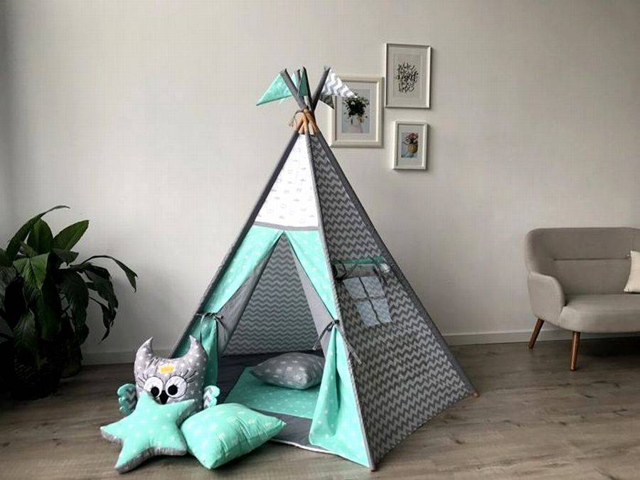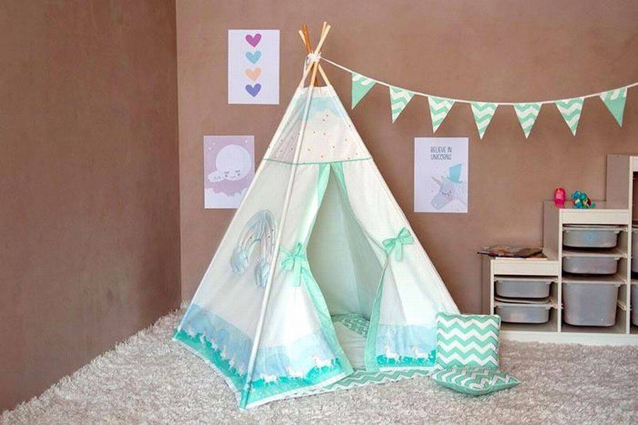 Вигвам из ткани нейтральных тонов может стоять в любой точке квартиры. Но цвет все-таки необходимо подбирать или хотя бы руководствоваться вкусом.