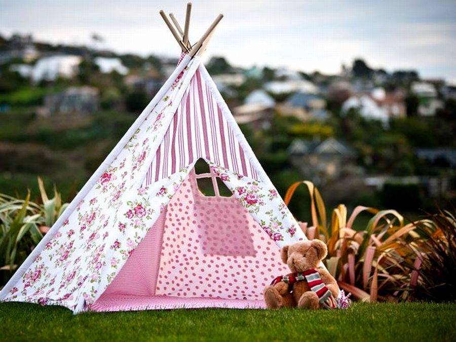 Расцветка вигвама приятно контрастна с окружающей природной средой. Романтический стиль понравится маленькой принцессе.