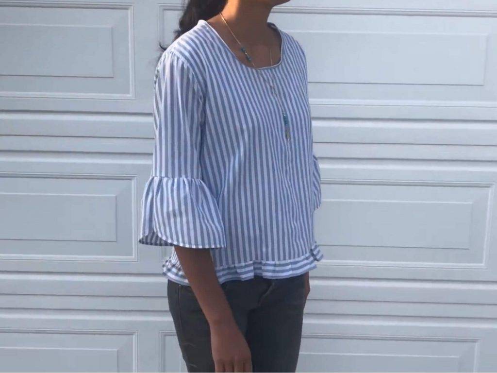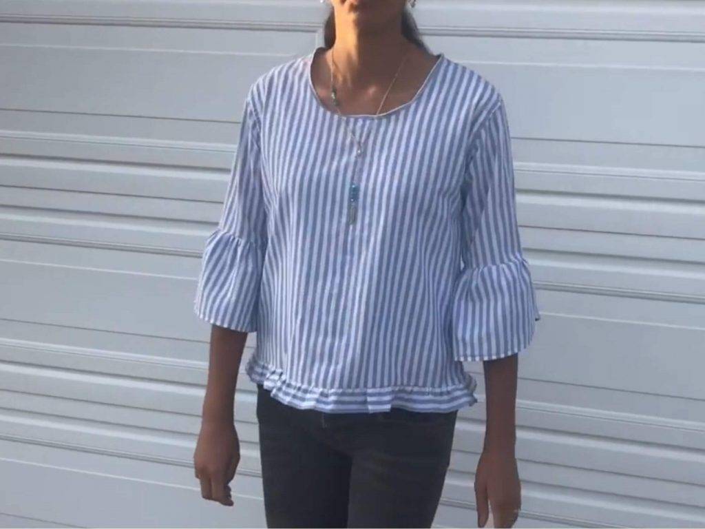 Предлагаем вам сшить вот такую модную кофточку из мужской рубашки. Лучше, если это будет ткань с хлопком — хлопковую ткань шить легче, она не скользит по игольной пластине.