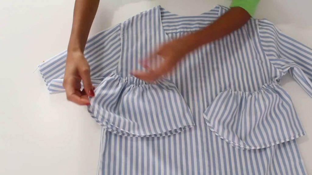 Подошла очередь рукавов. Берём низ рубашки, который мы отрезали в начале мастер-класса. У нас 1 большая деталь (со спинки) и 2 маленькие (с полочек). Большую деталь сгибаем пополам, 2 маленькие детальки складываем друг с другом. Получилось 2 волана для рукавов. Смотрим, чтобы они были симметричны. Сшиваем большую деталь 1 раз, а на маленьких деталях делаем 2 шва.