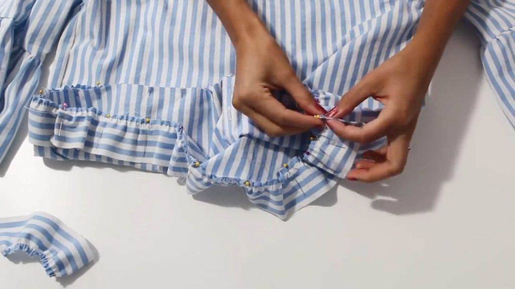 Затянем нитку так, чтобы верх волана соответствовал срезу рукава. Рубашка у нас на лицевой стороне. Итак, к рукаву приложить сосборенный волан лицевая к лицевой, сколоть булавками. Прострочить на 1 см. от края. Шов обработать зигзагом, заутюжить вниз.