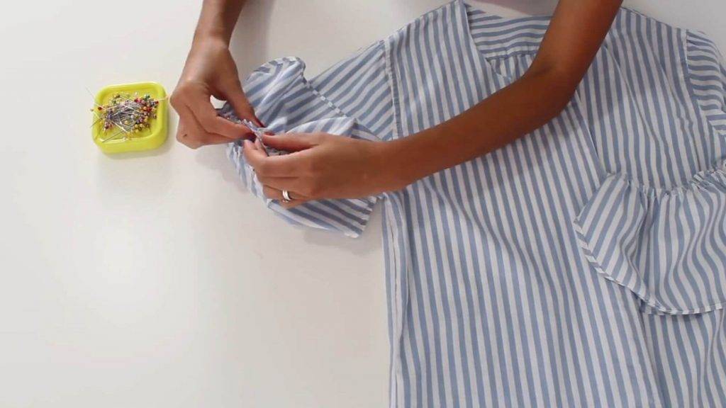 Разглаживаем рубашку утюгом, расправляя складки и помятости. Мужская рубашка у нас не очень большого размера, уменьшать плечи мы не будем. Одеваем рубашку на себя. Берём в руки портновскую булавку и обозначаем (уменьшаем) пройму, а также определяемся с длиной рукава. Учитываем то, что на рукаве у нас будет ещё и волан. Прикладываем сантиметр к полочке — намечаем нужную длину блузки. Записываем на листок и прибавляем 1,5 см. на припуск.