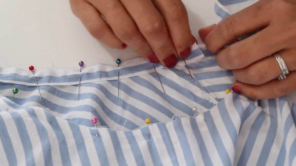 - Сборка сбоку участка горловины с помощью наметочных стежков так, чтобы ее длина была такой же, как и длина обтачки горловины;
