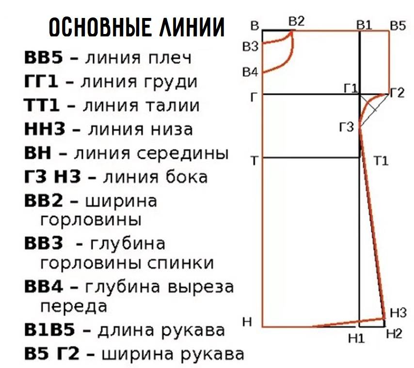 - Вверх провести линию, до пересечения с границей верхней отметки. Это начало проймы. Соединить с отметкой рукава (18 см).