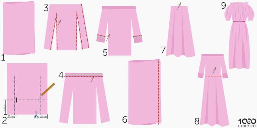 Для верха платья возьмите прямоугольник из ткани. Сложите пополам. У вас получится длина от плеча до талии плюс десять сантиметров. Разрежьте его. От края, отложенного на ширину рукава — 25 сантиметров. Отложите 45 см снизу. Измерьте ширину бедер плюс 9-15 сантиметров между рукавами.