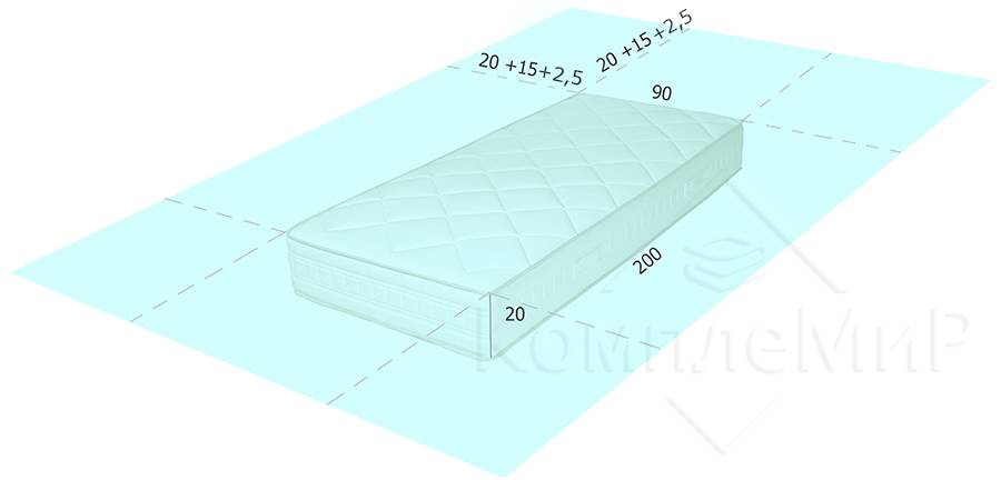 Так как высота нашего матраса 20 см, то к каждой его стороне надо приплюсовать эту величину и еще добавить 15 см ткани непосредственно под загиб простыни под сам матрас + под загиб торцов под саму резинку и обработку краев ткани 2,5 см.
