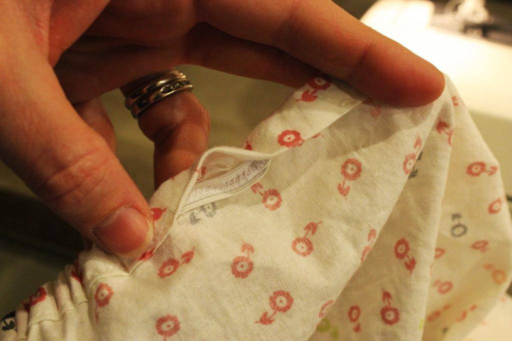 - растянуть резинку под тканью до второй метки, пристрочить параллельно угловому шву (оба конца);