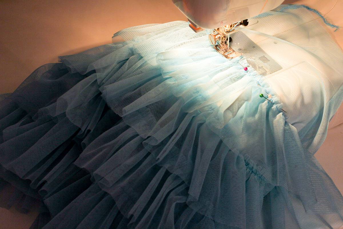 Теперь приступаем к изготовлению рюшей. Отстрачиваем полосы фатина вдоль, отступив от краешка 5-7 мм, на нулевой плотности самыми длинными стежками, затем тянем за нижнюю ниточку, собирая фатин в сборку. Коэффициент сборки равен 2,5, то есть для формирования складочек нам понадобится в 2,5 раза больше ткани, чем ширина юбочки.