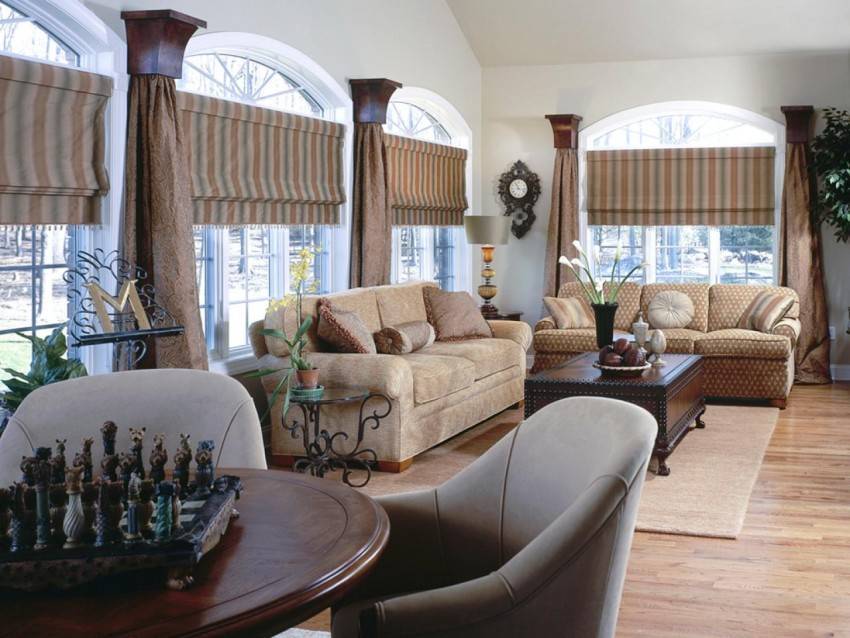 Римские шторы могут обрамлять оконный проем любого формата. Можно сочетать на одном окне римские шторы, закрепленные над оконным проемом и другие типы штор, например, плотный занавес. При заказе нестандартного карниза можно выбрать не только желаемый размер, но и техническое оснащение изделия.