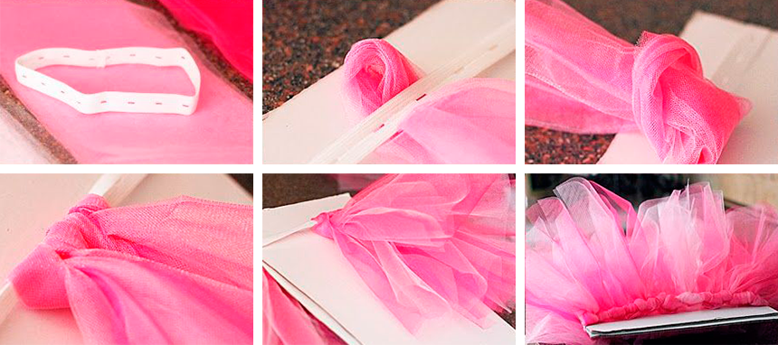 Наметаем ткань для юбки и фатин, а затем собираем их в ширину равной поясу.