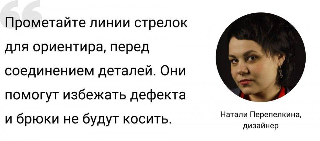- Обязательно примеряйте брюки в процессе работы. Так вы минимизируете время на их переделку и избежите порчи ткани.