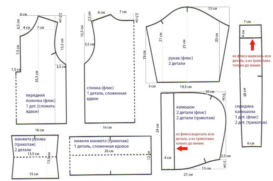 Выкраиваем спинку и рукава из футера. Деталь переда — из флиса. Заготовки для манжет и полоску для обработки горловины вырезаем из рибаны. Для определения нужной длины полоски для обработки горловины нужно измерить общую длину срезов выката. Длина полоски из рибаны должна равняться 0,75 общей длины срезов и иметь ширину 4 см.