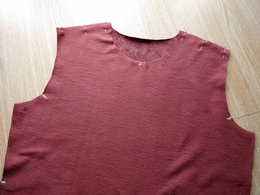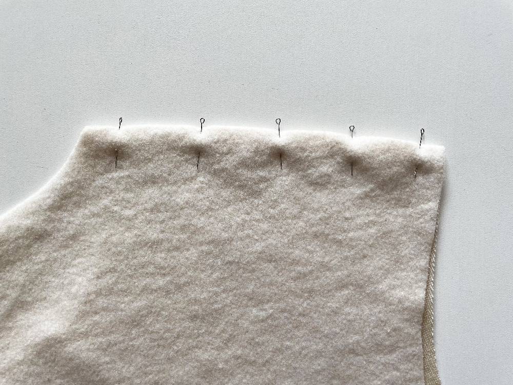 Сложенную вдвое полоску для обработки горловины прикладываем к лицевой стороне изделия, совместив срезы. При этом срезы горловины немного растягиваем. Фиксируем детали булавками.