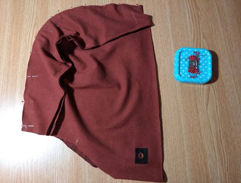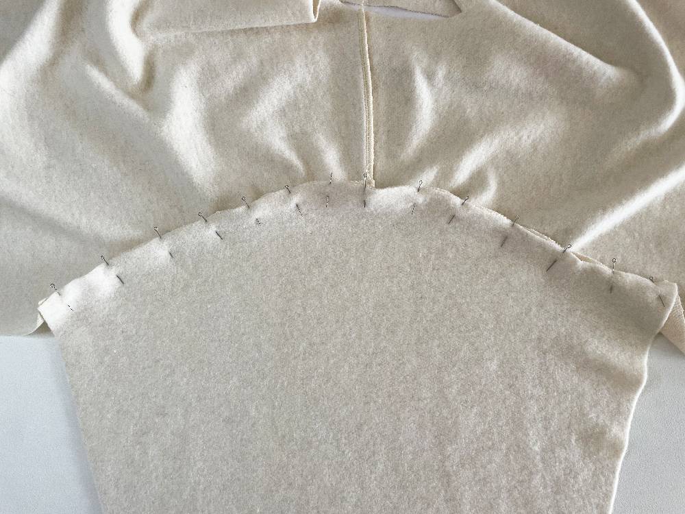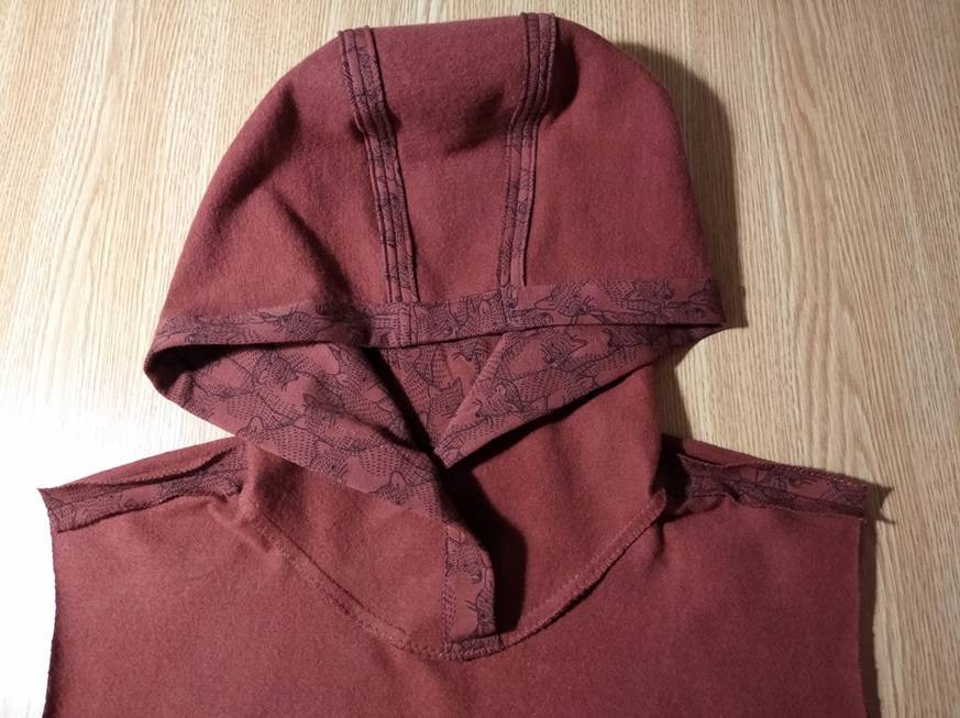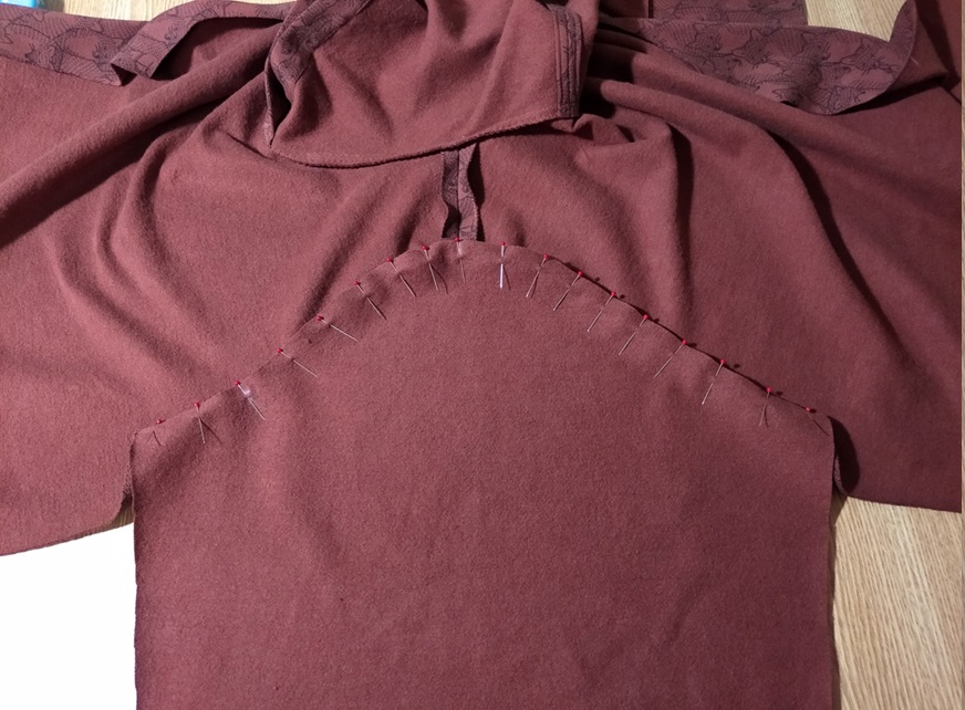 - Готовый капюшон накладывается на переднюю часть худи и спинку, совмещая линии середины. Сначала элементы сметываются, а затем стачиваются соединительной строчкой.