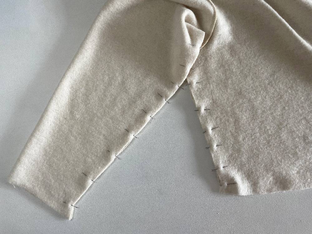 Далее передняя часть складывается со спинкой, а рукава складываются вдоль. С каждой стороны надо сколоть концы шва втачивания рукава, а затем соединить срезы рукава и боковые элементы.