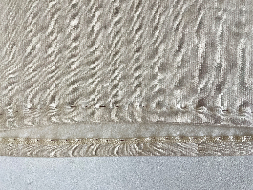 Подворачиваем нижний срез на 2 см на изнанку, подкалываем булавками. Выполняем намёточный шов, булавки убираем.