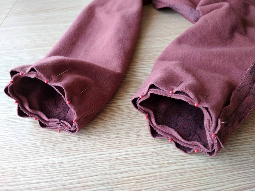 Прикалываем манжеты к нижним срезам рукавов, при этом немного растягивая манжеты.