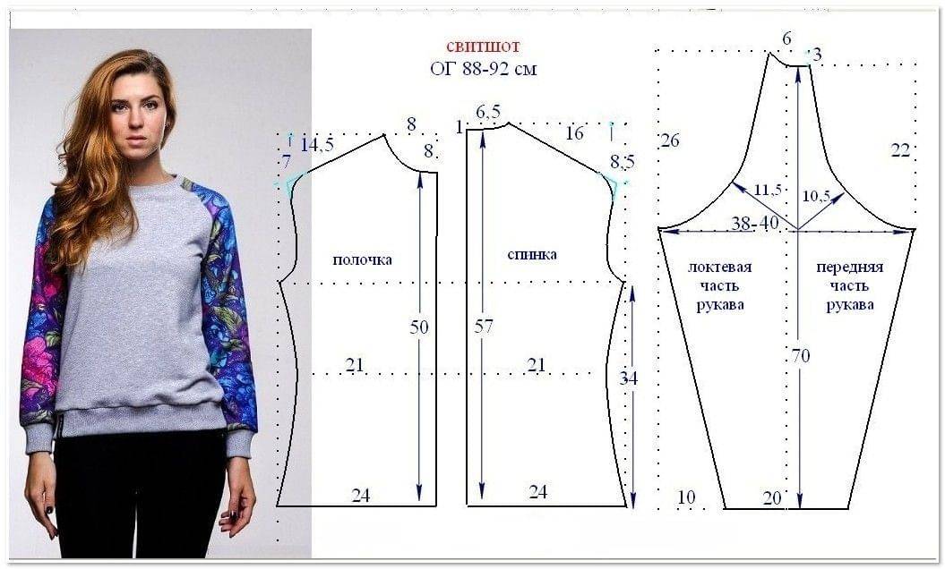 Для того чтобы сшить свитшот, понадобятся бумажные заготовки. Найти их несложно на специализированных сайтах или в журналах. Если такой возможности нет, удастся сделать чертежи самостоятельно. Снимать мерки необходимо с того, кто будет носить обновку. К точным данным можно прибавить несколько сантиметров для свободного облегания. Тогда вещь станет более объёмной и просторной.