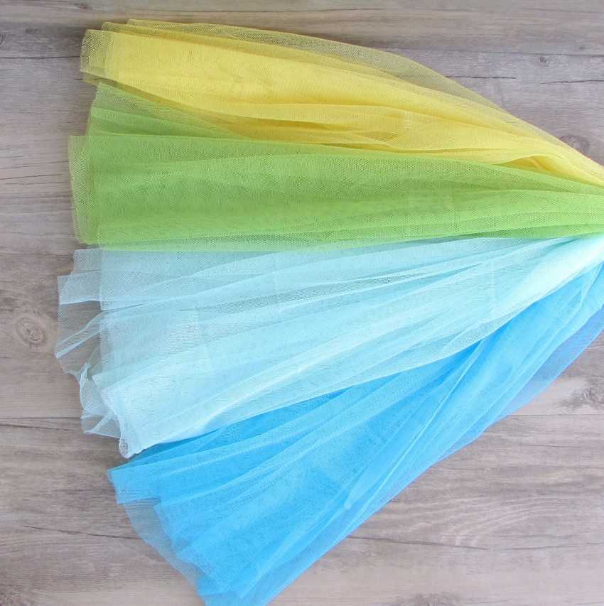 Начинаем с нарезания фатина: вам нужно 4 прямоугольника с длиной 3м (изначальный размер фатина) и шириной 21, 19, 17 и 15 см. Четыре потому что юбка будет четырехъярусная (вы можете сделать меньше или больше).