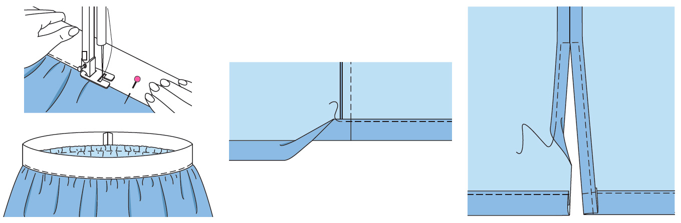 Вдоль верхнего среза юбки проложить две строчки на расстоянии 7 мм крупным стежком (ок. 4 мм), начав/закончив строчки у боковых линий. Нити коротко не обрезать.