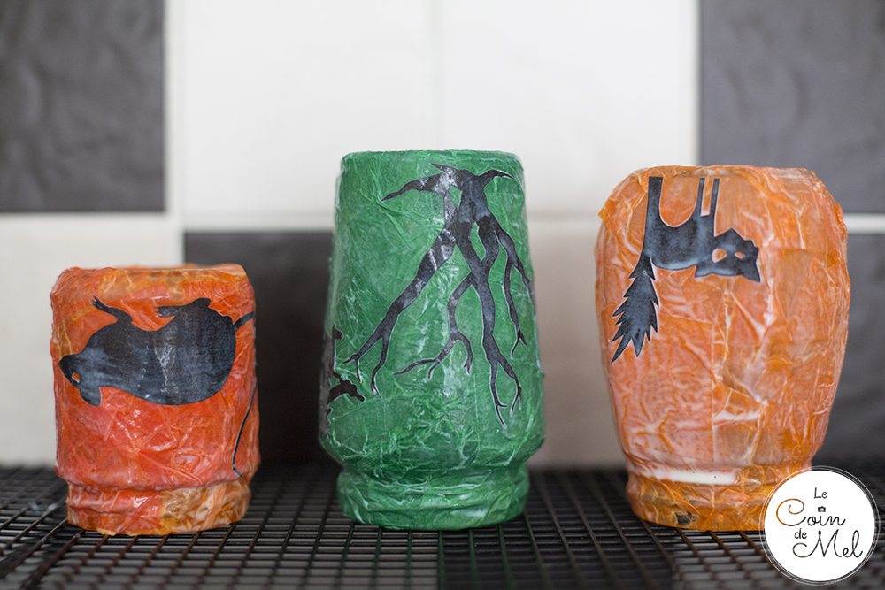 Коллекция монстров на Хэллоуин получится из пластиковых бутылок, раскрашенных акриловыми красками. Краски сохнут очень быстро и затем не пачкают, безвредны для детей. Нос и глаза также можно вылепить из пластилина.