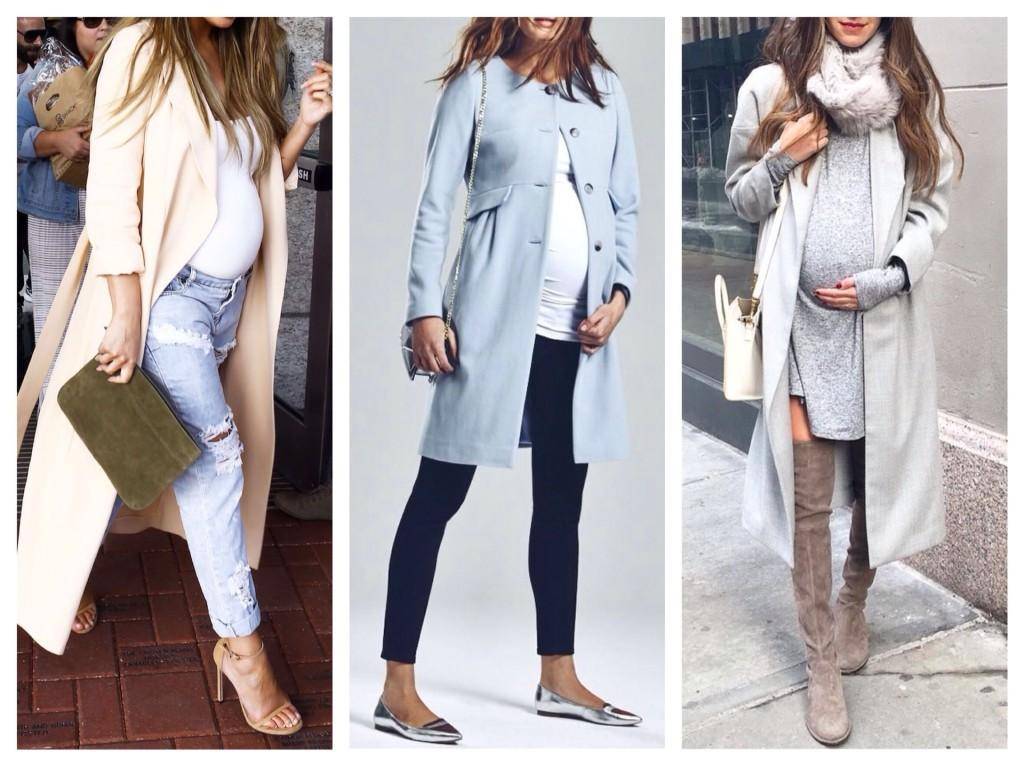 Верхняя одежда — предпочтение отдается в пользу утепленных пуховиков. Они легкие, свободные, содержат гипоаллергенный наполнитель, недорогие. Длина должна быть на уровне колена, с капюшоном и с молнией. Особенностью куртки для беременных является соблюдения размера по плечам и созданный запас в области живота. По дизайну могут быть с дополнительными вставками и трапециевидной формы.
