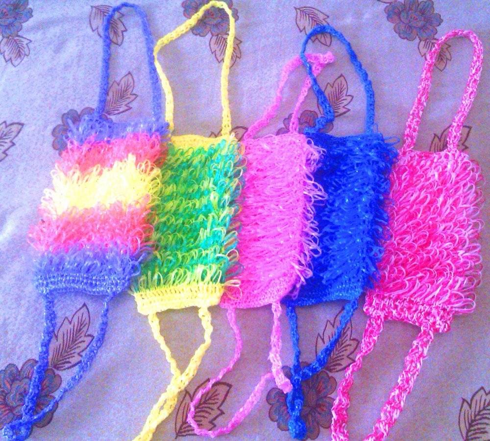 Форм мочалок много, поэтому, выбрать можно любую. Главное, сделать ручки, чтобы можно было повесить ее на крючок.