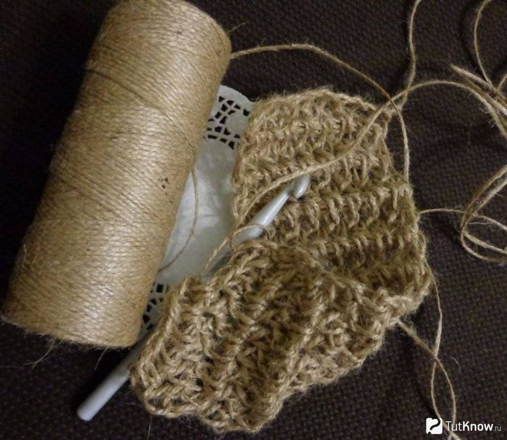 В идеале нужно купить более тонкий шпагат, не скрученный из нескольких волокон, а представляющий собой что-то вроде тоненькой ленточки. Его лучше брать с приличным запасом, потому что из-за вытянутых петель получается большой расход материала.