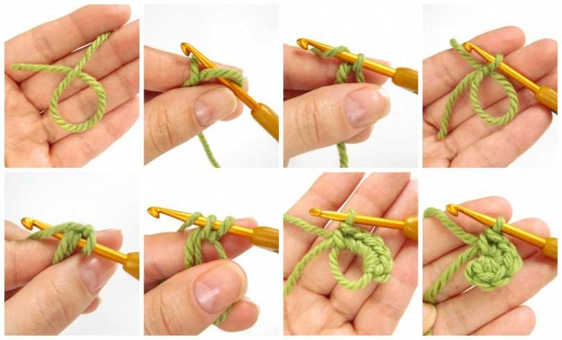 Любое вязание крючком начинается с кольца или цепочки, состоящей из так называемых воздушных петель (в.п.). Чтобы связать ее, необходимо сначала выполнить скользящую петлю. На фото ниже показана последовательность выполнения скользящей петли.