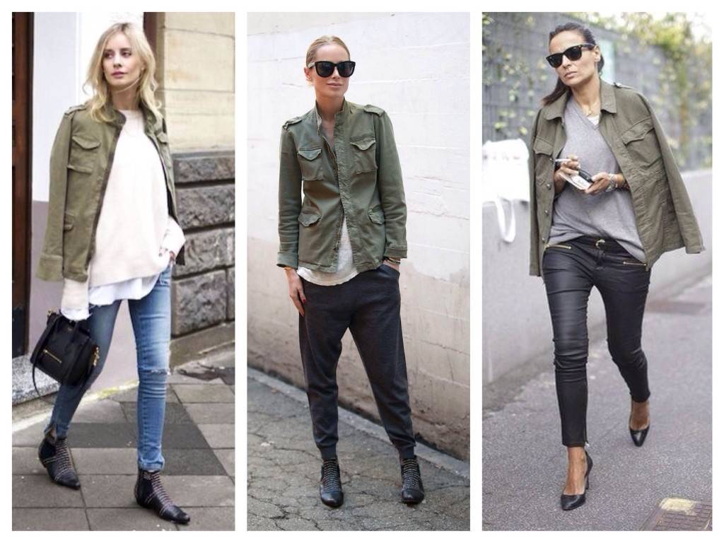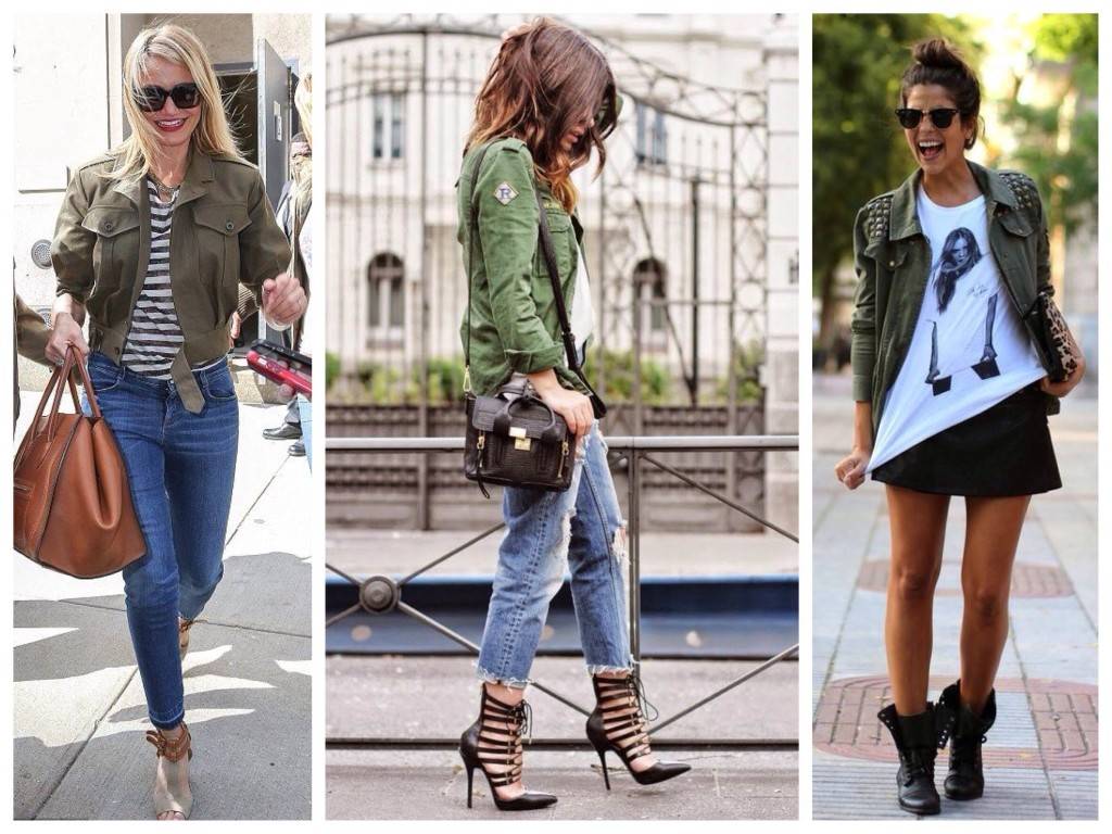 Стиль милитари будет отлично сочетаться с джинсами и полосатым принтом