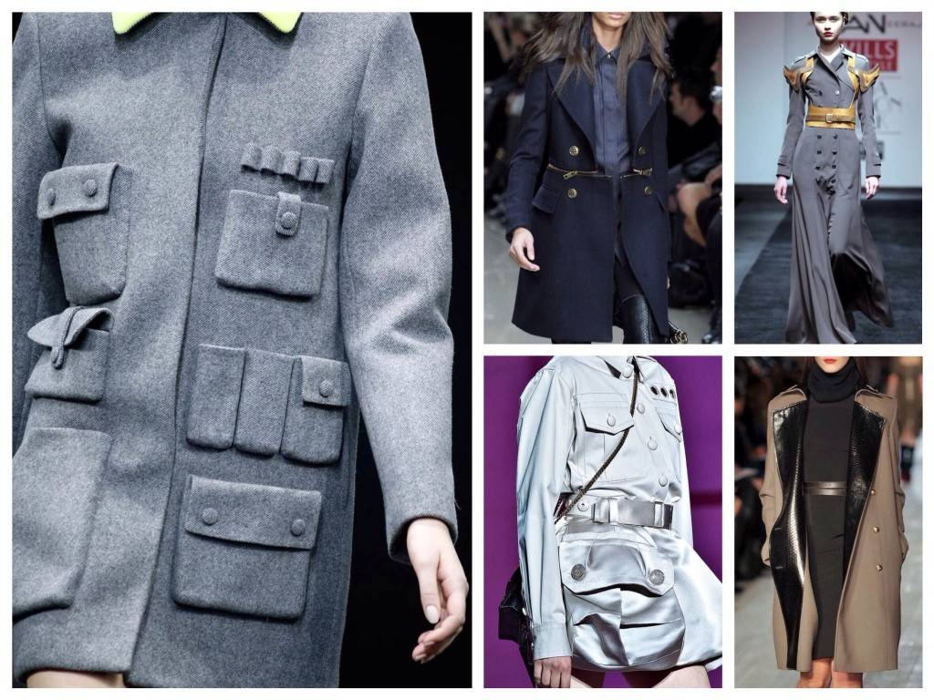В женском гардеробе среди наиболее актуальных предметов верхней одежды стоит выделить: бушлат, шинель, тренчкот, куртка «авиатор» и френч. Для пошива такой верхней одежды рекомендуется использовать натуральные материалы. Это может быть 100% кашемир или шерсть с добавлением синтетических волокон, но предпочтение можно отдать и бархату, плюшу или тяжелому шелку.