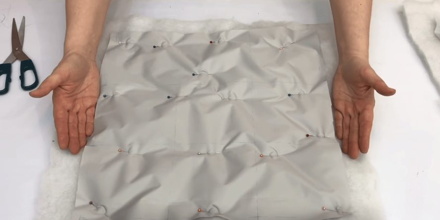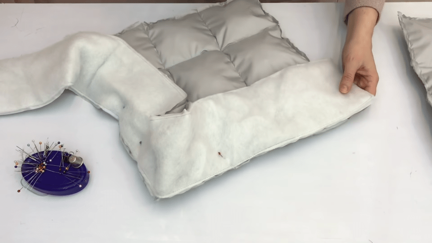 Возьмите только что отпоротую заднюю часть второго рюкзака, поместите его лицевой стороной вниз. Положите на нее вторую поролоновую подушку в центр, сверху накройте ее передней стороной первого рюкзака лицевой стороной вверх. Приколите заднюю панель к передней панели с карманом, оставив поролоновую прослойку внутри, и сшейте на машинке.