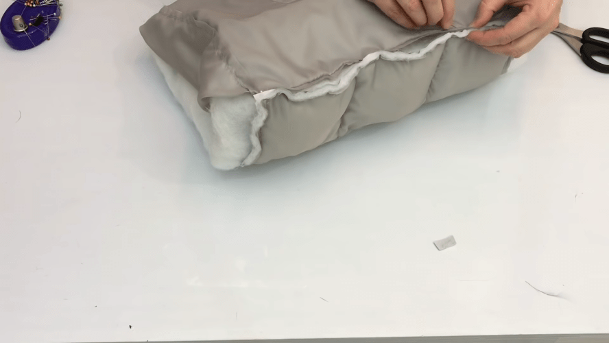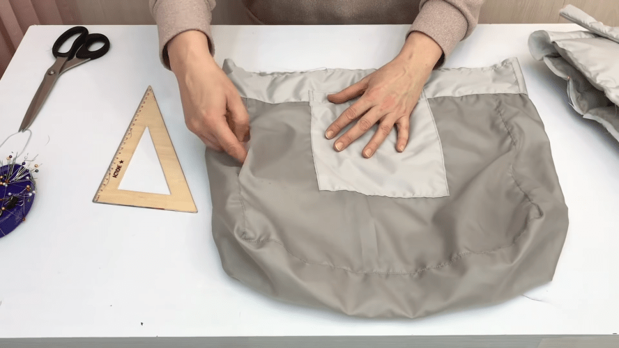 Подготовленную деталь из подкладочной ткани также вкладываем лицевой стороной внутрь, соединяя края. Скалываем и сшиваем все три части по заглаженной линии.