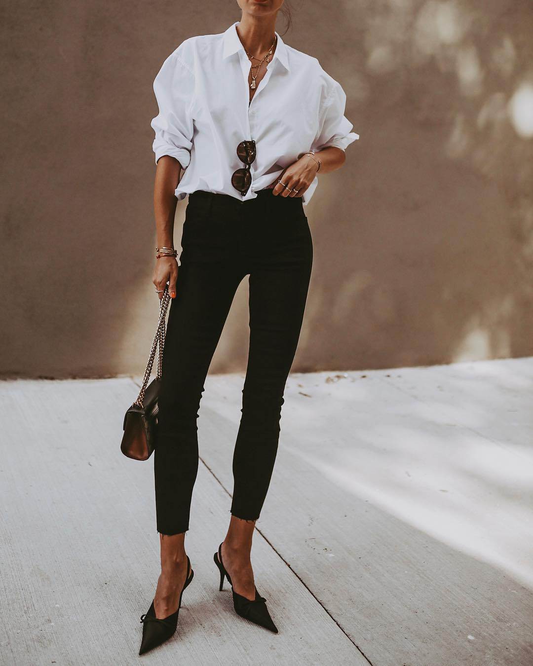 Хотите выглядеть элегантно и со вкусом? Тогда предлагаем вам облачиться в классическую белую рубашку мужского кроя в сочетании с темно-синими джинсами скинни. Небольшая сумочка и туфли на каблуке станут завершающими штрихами образа.