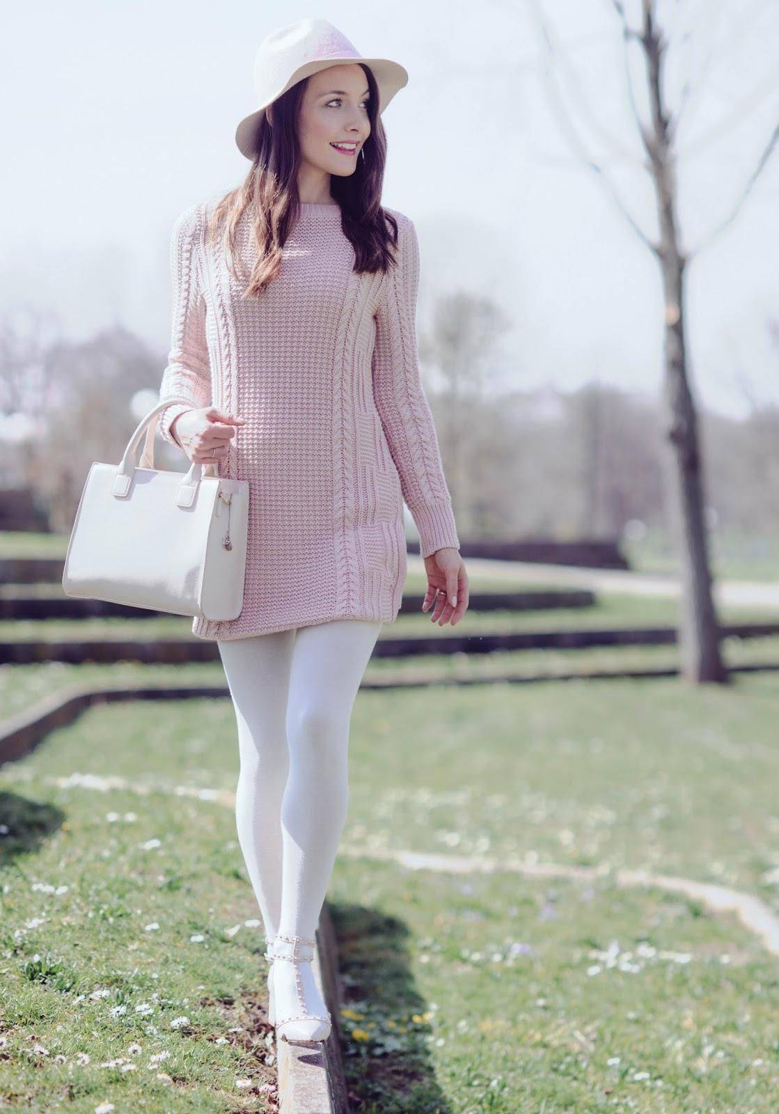 Каждый вариант по-своему интересно смотрится. Главное, чтобы платье хорошо сочеталось с чулками в белом цвете. Обувь при этом может быть как грубая в виде ботинок, так и женственная в виде ботфортов. Элегантное удлиненное пальто и стильная сумка – то, что нужно для современного наряда.