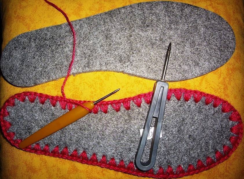 Посередине подошвы и боковой стороны ставится насечка. Прикладываете две половинки так, чтобы насечки совпали. Закрепляете шов по краю булавками и начинаете сшивать нитками мулине. И вот наши тапочки готовы.
