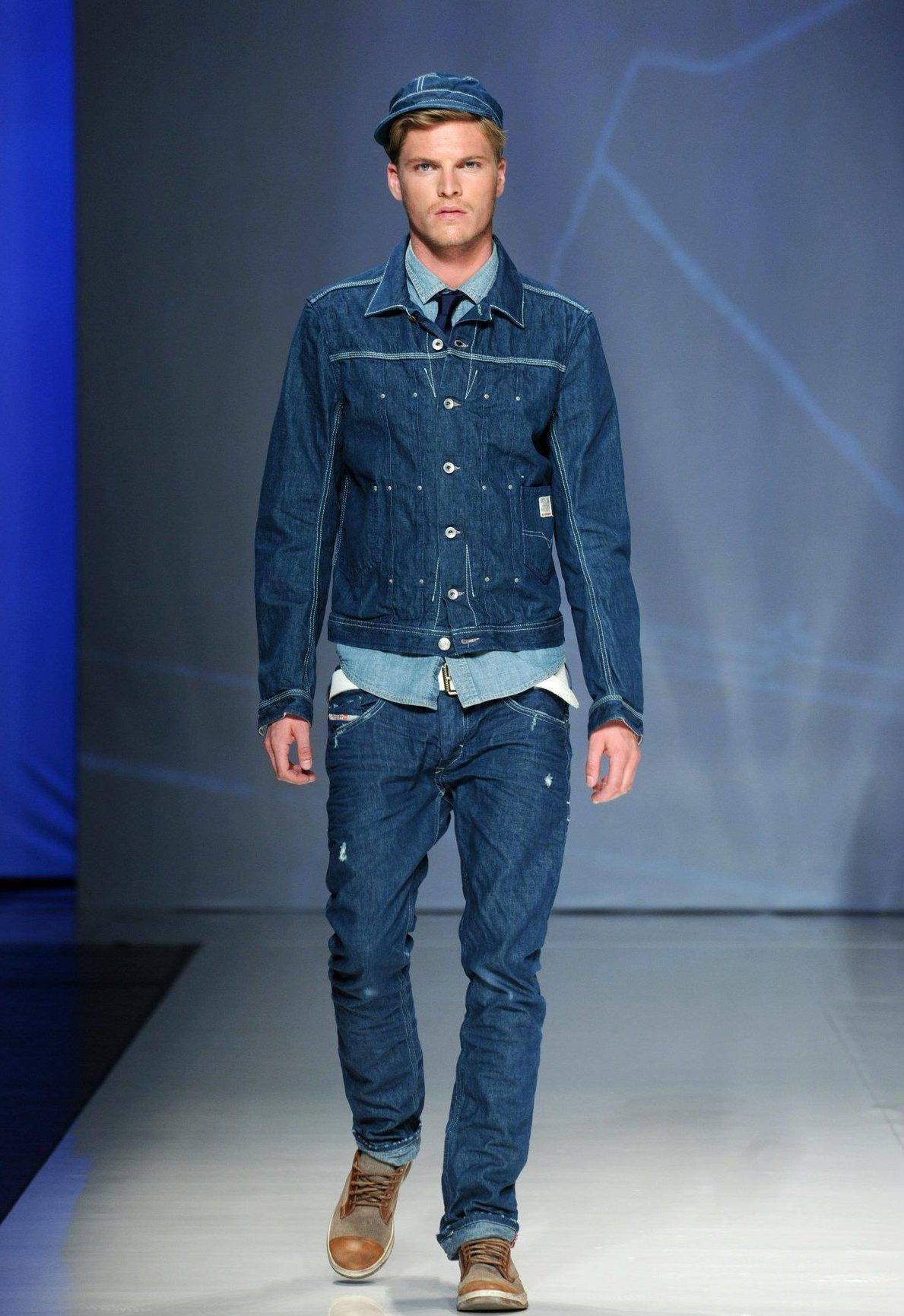 Самым классическим сочетанием является куртка с джинсами; дизайнеры советуют их выбирать на один-два тона темнее. Чтобы образ мужчины выглядел при этом гармонично, его советуют дополнить полуспортивной обувью – топсайдерами или мокасинами. Классические туфли, а также кроссовки и кеды под джинсовую куртку не подходят. Исключение можно сделать, заменив брюки-денимы на брюки из вельвета, а куртку выбрать с капюшоном.