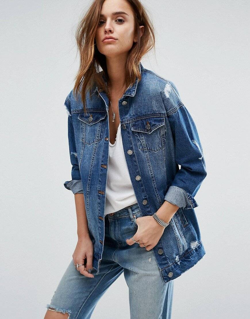 Важно помнить, что, отдавая предпочтение джинсовке оверсайз или же удлиненной джинсовой куртке, остальные детали лука должны быть по фигуре: к примеру, приталенное платье, водолазка, леггинсы или зауженные брюки либо джинсы
