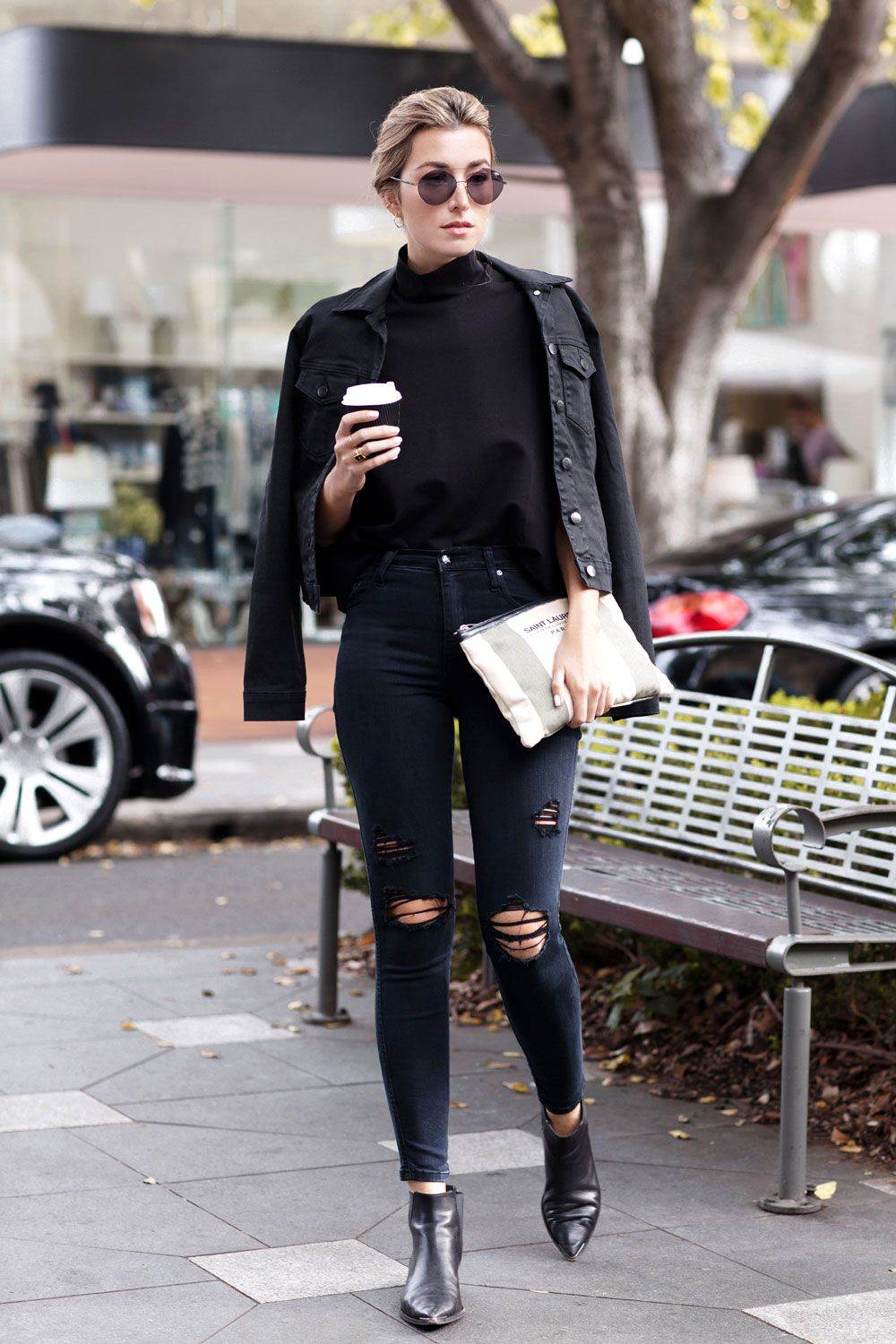 - Если вы сомневаетесь в синей джинсовой ткани на синей джинсовой ткани, черные узкие джинсы-это легкий путь для синей джинсовой куртки! Вы можете также носить свою джинсовую куртку с цветными джинсами или белыми джинсами.