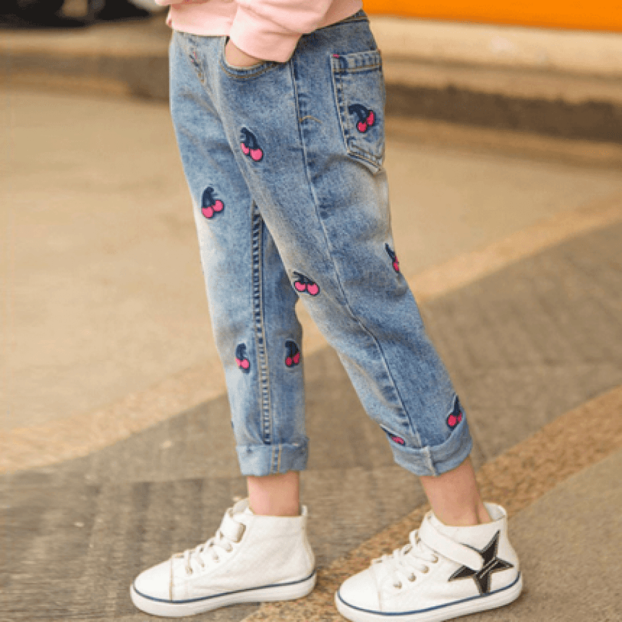 Детские джинсы для девочек варьируются также в своем декоре. Их можно искусственно состарить, украсить заплатками или дырками. Ткань нередко содержит вышивку, принты, бусины, цветочные и кружевные вставки, стразы. Юным модницам особенно по душе модели, содержащие изображения героев из мультфильмов или надписи.