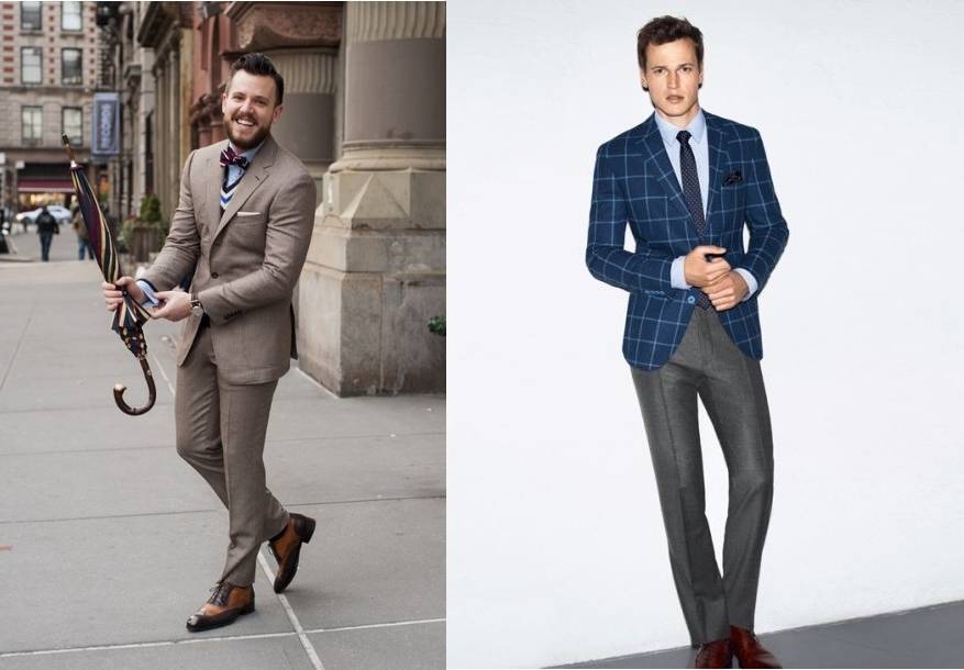 Лучшим сочетанием является насыщенный васильковый цвет джинсов под коричневый пиджак. Дополняют комплект футболкой светло-голубого или бежевого цвета. Для завершения образа нужно подобрать галстук и туфли оксфорды в коричневых тонах.