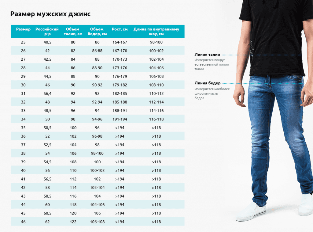 - в отличие от женщин, у молодых людей необходимо измерять не самое узкое место талии, а ту область, где обычно проходит пояс на джинсах классической модели. Вот это расстояние и нужно учитывать при определении размера. В российской системе оно измеряется в см, во всех остальных — в дюймах. Таблицы, приведенные выше, помогут узнать свой размер джинсов по готовым замерам;