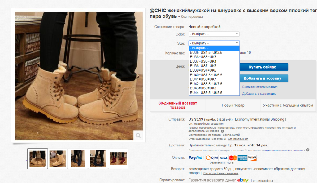Учитывайте, что максимальный размер женской обуви на «Ебей» часто заканчивается на отметке 39. Поэтому, если вам надо выбрать 40 или 41 размер, «Ебей» вам не подойдет.