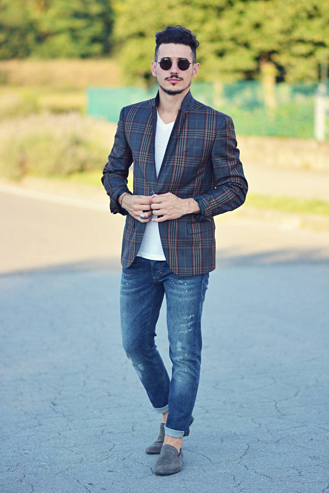 Во-вторых, следует учитывать собственное телосложение. Стройным представителям сильного пола подойдут однобортные модели, а для тех, кто обладает определенными огрехами в силуэте, — двубортные, зрительно удлиняющие торс. Также значение имеет и длина полы пиджака. На фото модных блоггеров можно заметить, что в идеальном комплекте она зрительно делит силуэт пополам, но при этом всегда ниже линии пояса джинсов и не спускается за середину бедра.