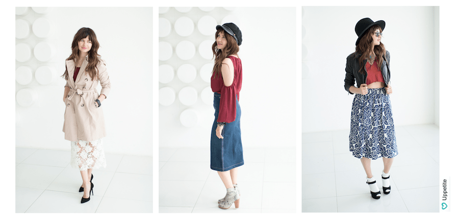 - Миди (чайная длина) – юбка средней длины до или ниже колен. Является универсальным вариантом, подходящим для нарядов разных стилей. Обычно миди заканчивается в самой широкой части голени, что визуально сокращает длину ног. Это можно компенсировать, сочетая вещь с высокими каблуками или открытыми босоножками, чтобы удлинить ноги. Желательно выбирать подол на уровне самой тонкой части икры.