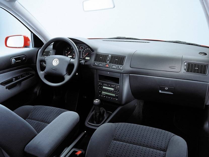 Свободного места внутри Фольксвагена Гольф mk4 стало больше, сзади могут сесть три пассажира и с легким комфортом доехать. Поменяли стиль панели приборов, оставив ей аскетизм. Центральную консоль для еще большего улучшения эргономики немного повернули в сторону водителя. Оснащена она также магнитолой, органами климата и двумя выдвижными подстаканниками.